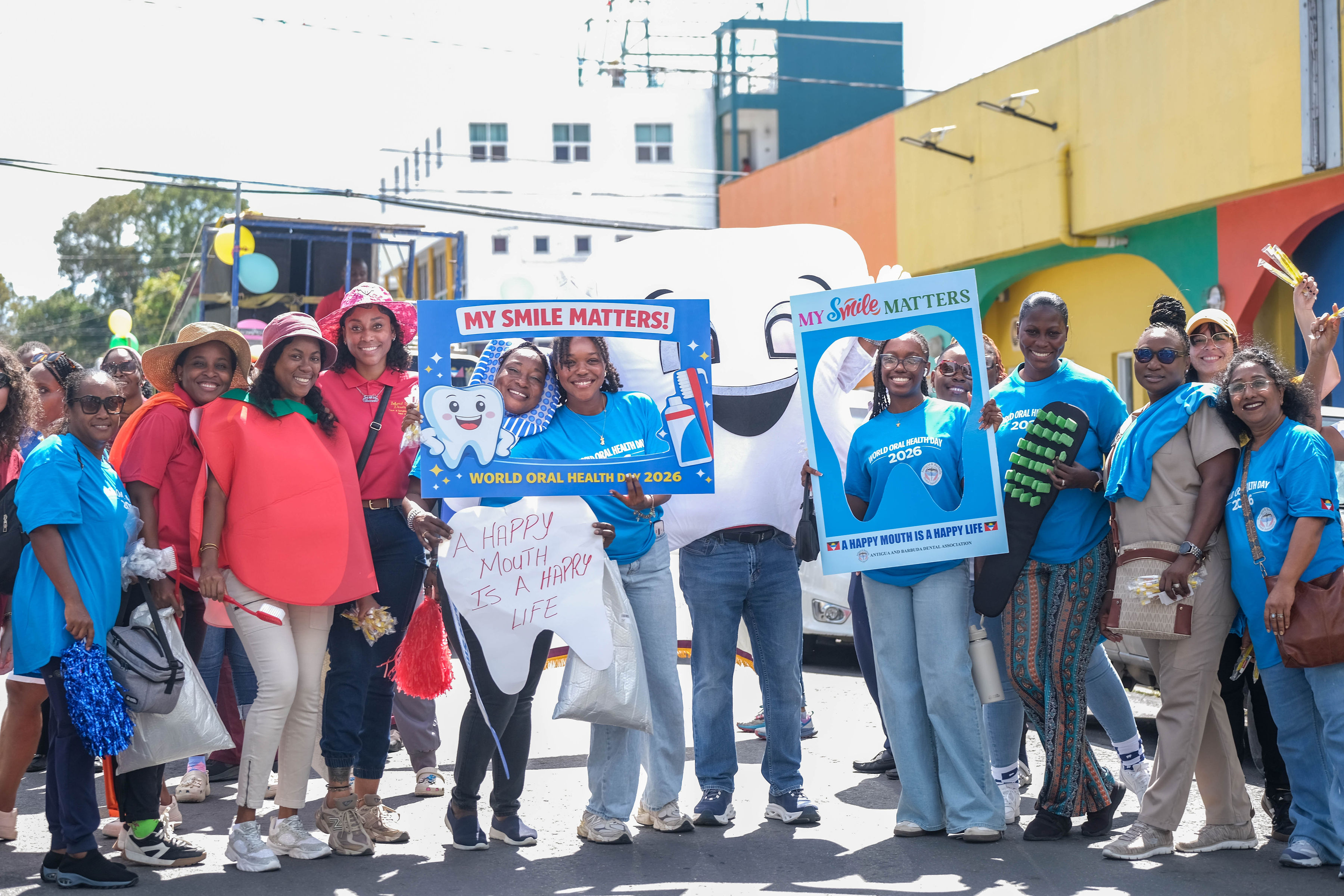 Promotion began with radio advertisements featuring Toothie, the official FDI mascot, ending with our parade message and helping to build public anticipation and awareness. The parade opened with our police escort, followed by the Bon Appétit Drum Corps and bold 3 ft by 6 ft banners displaying the World Oral Health Day message and the logos of ABDA and FDI. The procession featured Toothie, fruits, vegetables, Mr. Toothpaste, and other costumed characters; 50 children from our Sunny Smiles schools accompanied by teachers; dentists walking and driving; and two decorated trucks carrying banners with messages such as “Your Smile Matters” and “Drink Water, Eat Fruits and Vegetables,” along with the 2026 slogan. Eighteen medical students from the University of Health Sciences Medical School participated, along with volunteers, first responders, and the Antigua and Barbuda Red Cross ambulance, one of our coalition partners. Participants wore blue World Oral Health Day T-shirts, while the costumes, music, movement, and color brought oral health and nutrition education to life. A main feature of the parade was also the photo frames taken with people who were lining the streets. They enjoyed having their pictures taken. Over 1,000 toothbrushes and toothpaste were given out along with 43 certificates for dental cleanings.