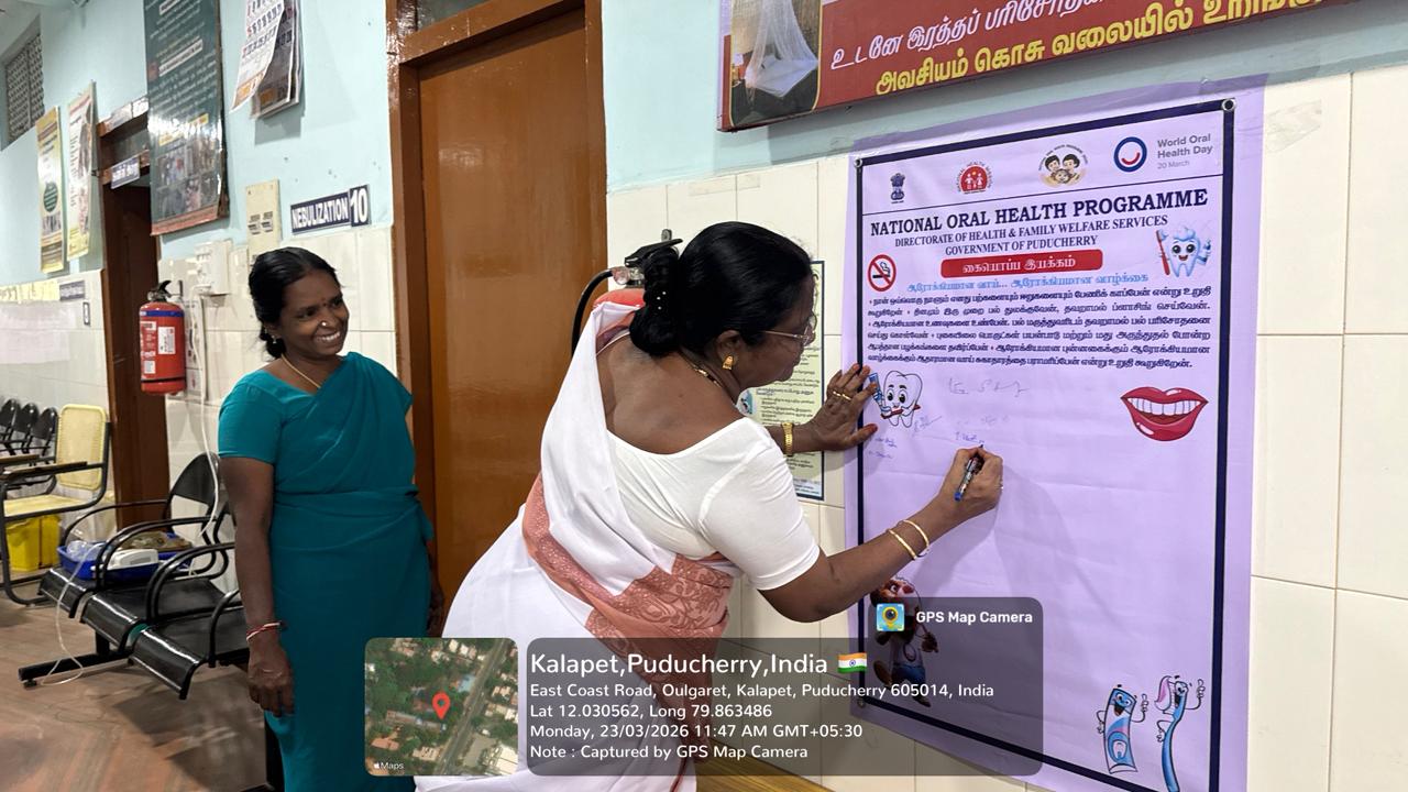 On 23.03.2026, in observance of World Oral Health Day, a signature campaign was conducted at PHC Kalapet to promote the theme “A Happy Mouth is a Happy Life.” The initiative aimed to raise awareness about the importance of maintaining good oral hygiene and its impact on overall health. Members of the public actively participated by signing the pledge, expressing their commitment to adopting healthy oral care practices. The campaign emphasized key messages such as regular brushing, balanced diet, and timely dental check-ups. Overall, the program served as an effective platform to encourage community involvement and promote long-term oral health awareness.