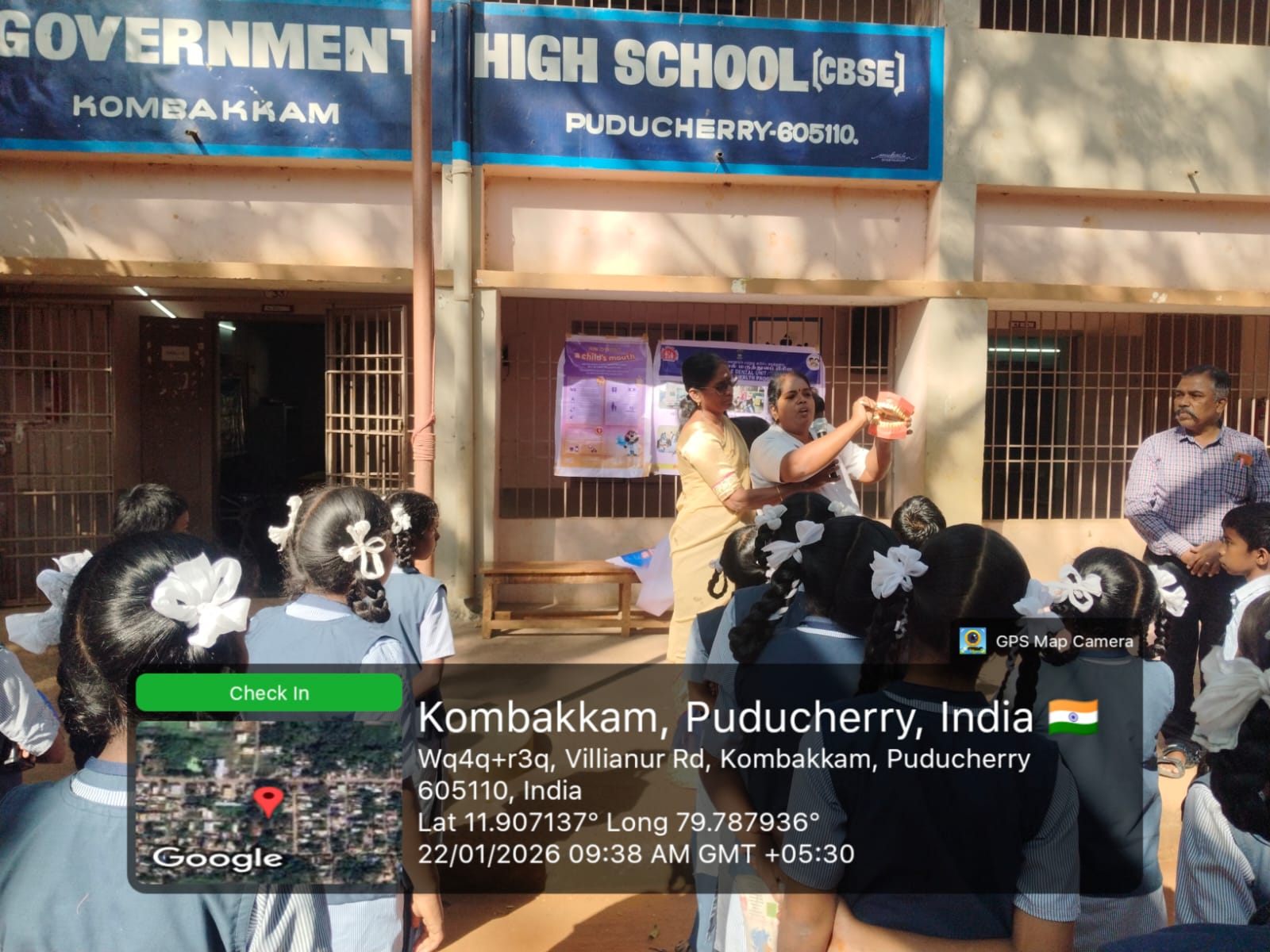 An oral health and tobacco awareness program was conducted by the School - MDU team at _Government High School,_ Kombakkam, on 22/01/2026. A health talk was delivered to students on the ill effects of tobacco and the importance of preventing oral cancer. The theme *“Happy Mouth Is A… Happy Life”* was introduced to emphasize the role of good oral hygiene in overall well-being. Oral hygiene education was provided, and correct brushing techniques were demonstrated using posters, banners, and dental models.