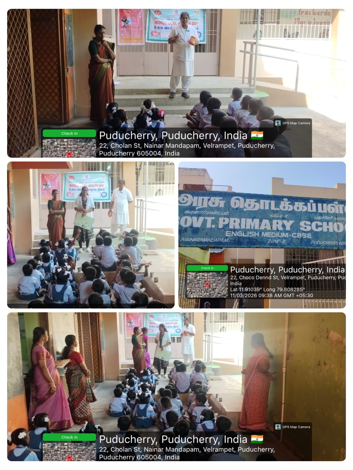 As part of the World Oral Health Day celebrations, an oral health awareness session was conducted at *Government Primary School Nainarmandapam* on 11.03.2026. School students were educated about the importance of maintaining good oral hygiene and healthy dental habits. Proper brushing techniques were clearly demonstrated using dental models to help students understand the correct method of brushing. The session encouraged children to take care of their teeth and practice daily oral hygiene. Nearly *103* students benefited from this awareness program.