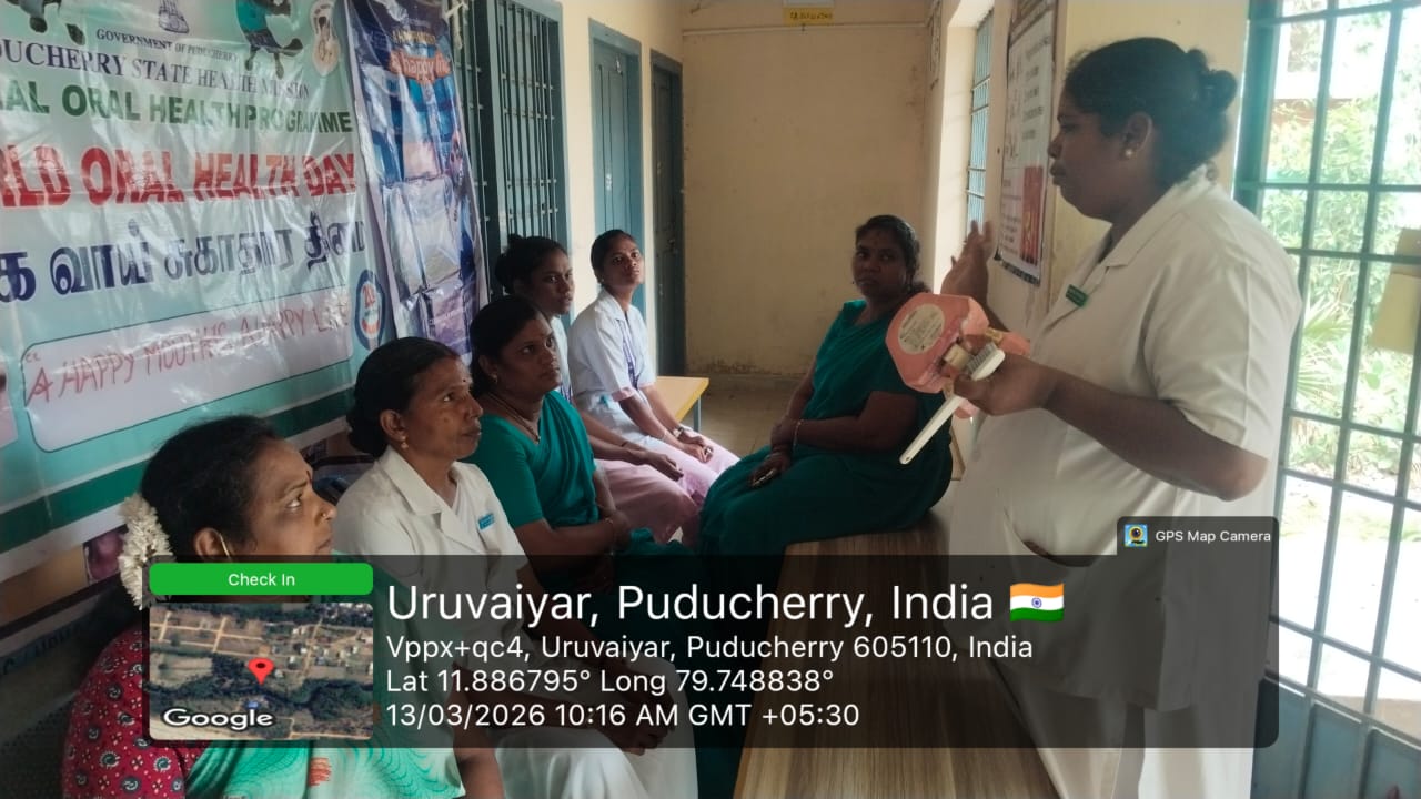 As a part of _World Oral Health Day celebration_ , a dental orientation session was conducted for the health workers at the *Sub-Center, Uruvaiyar* , on 13.03.2026. Nearly _15_ health workers participated and benefited from the session. The theme “ *Happy Mouth is a Happy Life”* was explained, highlighting the importance of maintaining good oral hygiene, early detection of dental problems, and promoting oral health awareness among the community. The staff actively participated and gained useful knowledge to educate the public.