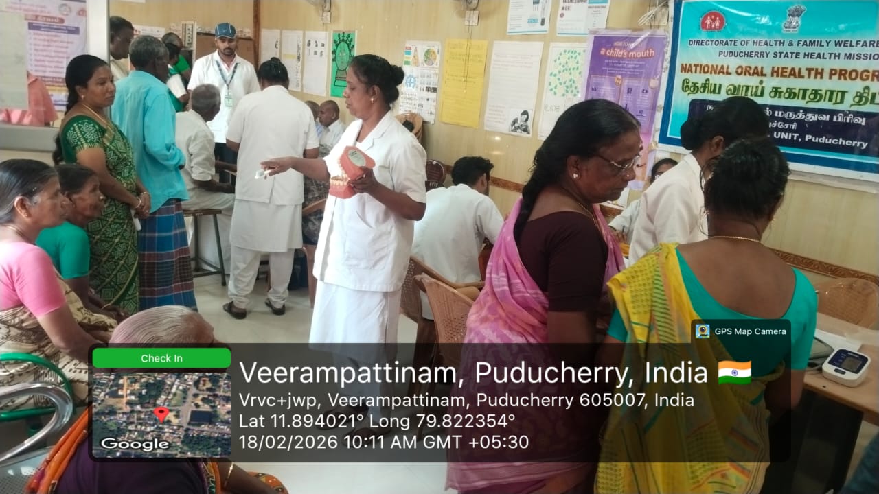 An oral screening camp was conducted at *Periyaveerampattinam* on 18-02-2026 as part of the _Seashore Integrated Health Camp_ organized by *Pondicherry AIDS Society Organization.* The camp aimed to improve oral health awareness and provide early screening services to the coastal community. Informative fact sheets were displayed to educate the public about the harmful effects of tobacco use and the importance of maintaining good oral hygiene.