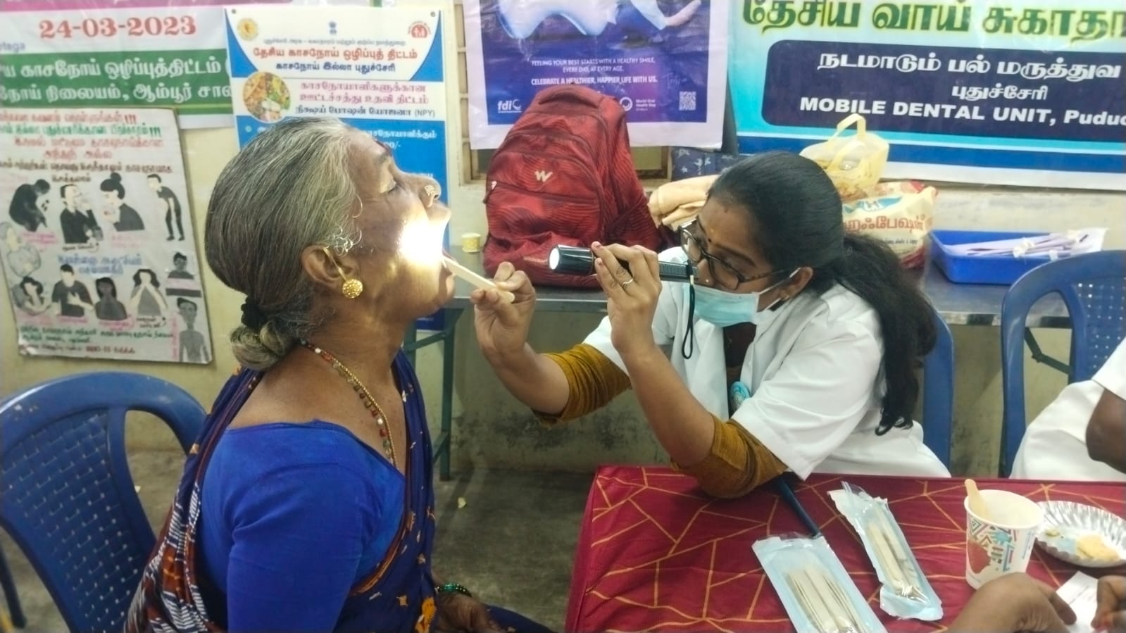 The camp was inaugurated by *Dr. Shamimmunisha,(Deputy Director of Public Health.)* and Dr. Meenu ( MO- Incharge of Avvai Nagar ).Oral cancer screening was carried out for the general public to promote early detection and prevention. Anti-tobacco awareness and dental health orientation sessions were conducted for the general public as well as nursing students of *Mother Theresa Nursing College*  to educate them about the harmful effects of tobacco and the importance of maintaining oral hygiene.