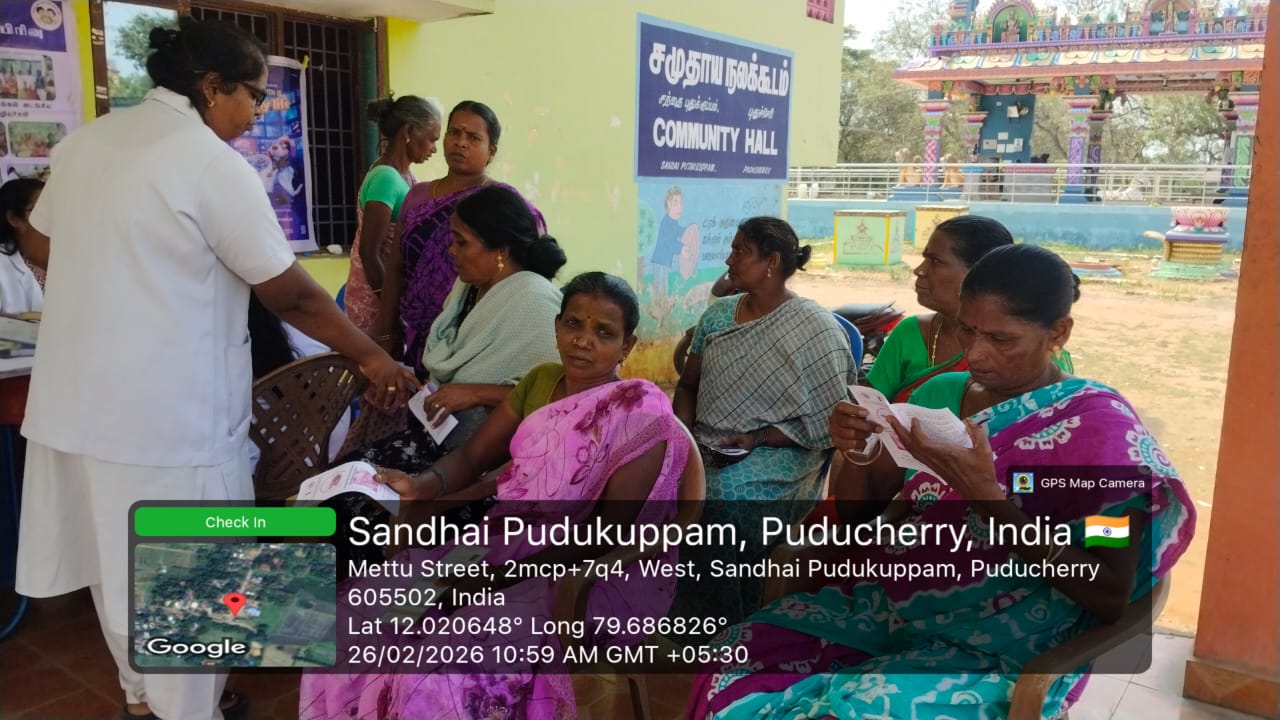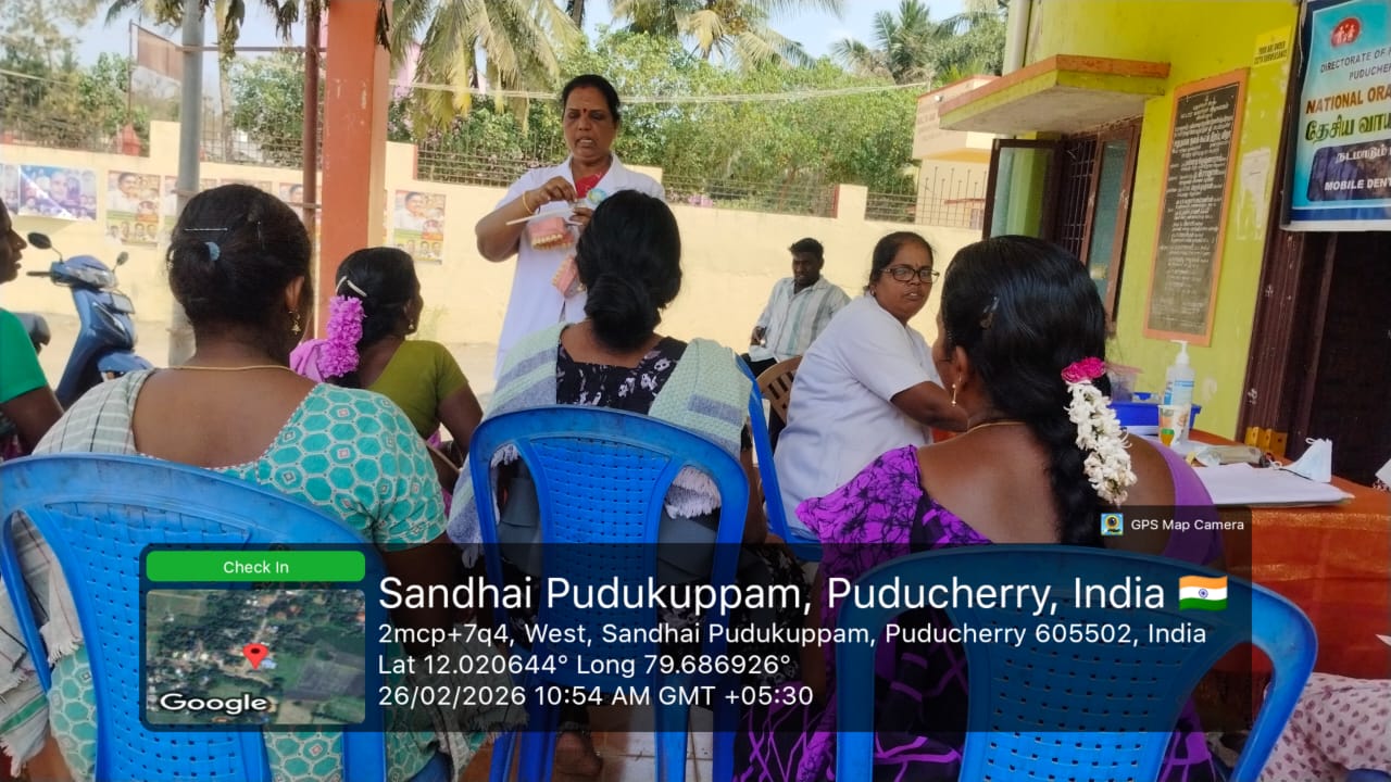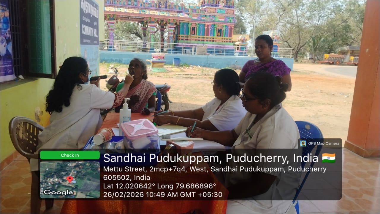 "On 26-02-2026, an overall oral health screening camp was conducted at *Community hall,  Sandai Puduppam,* for the general public. Participants underwent a thorough examination to identify common dental problems such as tooth decay, gum disease, oral infections, and other related conditions. The screening procedures and techniques were explained to create awareness about the importance of regular dental check-ups and early detection of oral diseases.